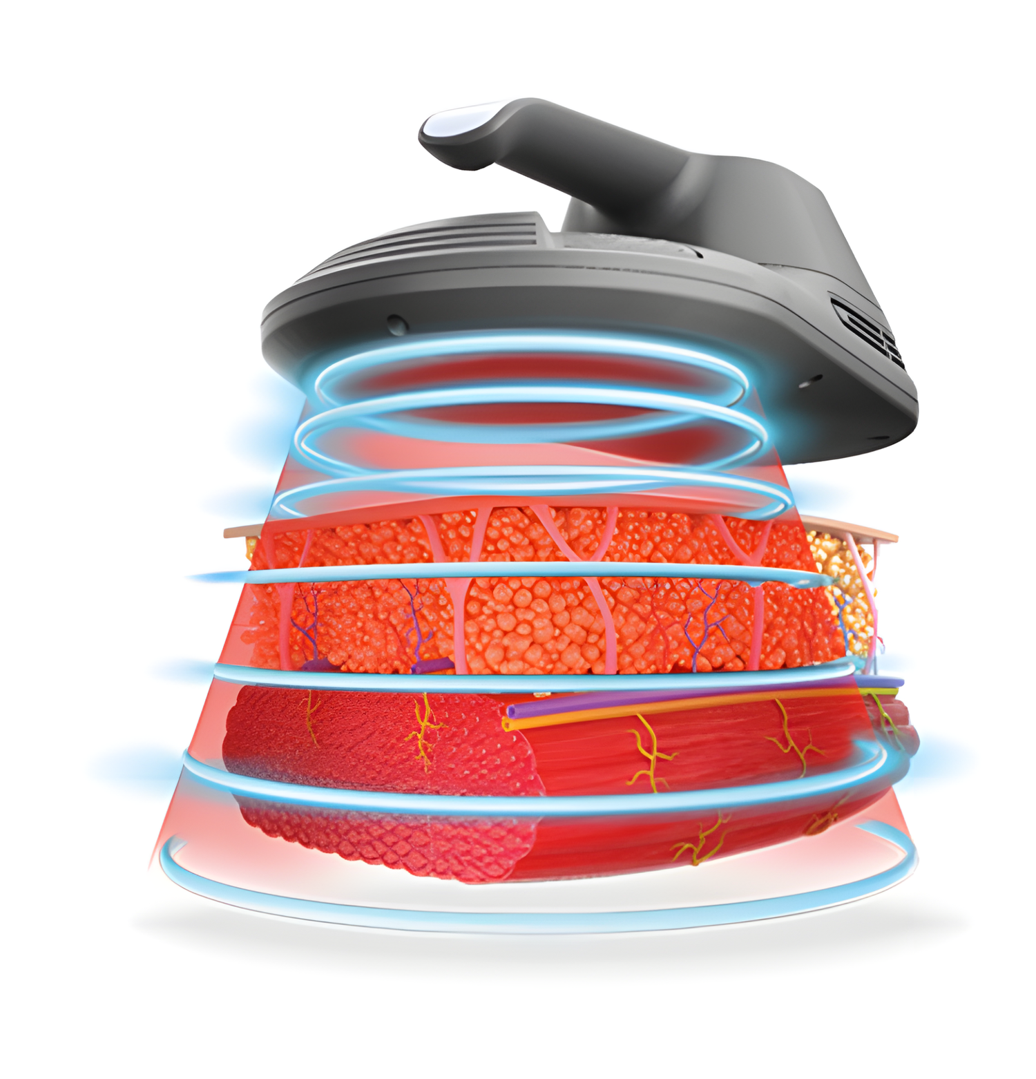 El dispositivo genera impulsos electromagnéticos (ondas RM y HIEMT+) que llegan a las capas musculares profundas, provocando contracciones intensas. Estas son más fuertes que las que se consiguen con los ejercicios de fuerza estándar, lo que acelera el desarrollo y el modelado muscular.