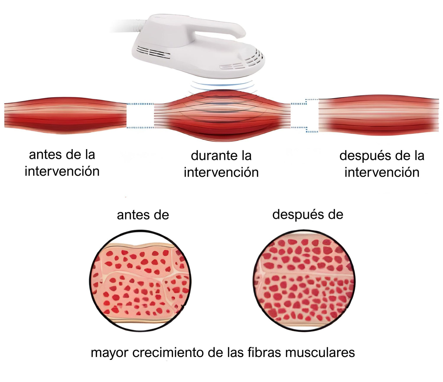 La energía magnética pulsante y concentrada penetra a través de la piel, llegando a las partes profundas de los músculos y provocando contracciones intensas. Es como entrenar sin esfuerzo: el dispositivo simula el trabajo de los músculos, como durante un ejercicio intenso.